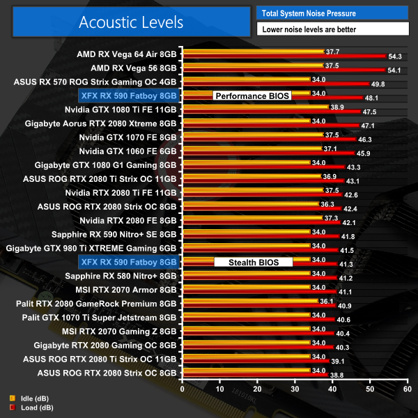 Here we come to one of the downsides to the XFX Fatboy – it is rather loud when using the performance BIOS, with a peak of just over 48dB making it around 6dB louder than the Sapphire Nitro+ RX 590..