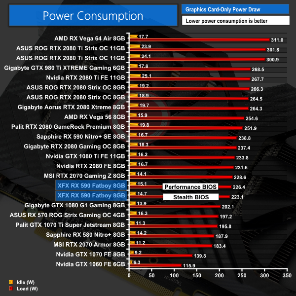 Both BIOS draw around 225W under load, and this is about 13W less than the Sapphire RX 590 Nitro+ SE. That might sound all well and good, but looking at the big picture, I have to say RX 590 is not very efficient at all – it is drawing similar levels of power to an RTX 2080, and we know how much faster that card is. Still, it is what it is.