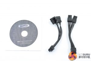 After that, the driver disk and two adapter cables (2x Molex to 1x 6-pin PCIe power, and 2x 6-pin to 1x 8-pin PCIe power) are also in the box.