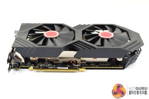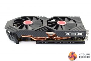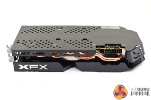 Moving back round to the front side of the card, we can see the XFX logo is stuck onto the bottom of the shroud via a sticker which could be easily removed if you didn't want it there.