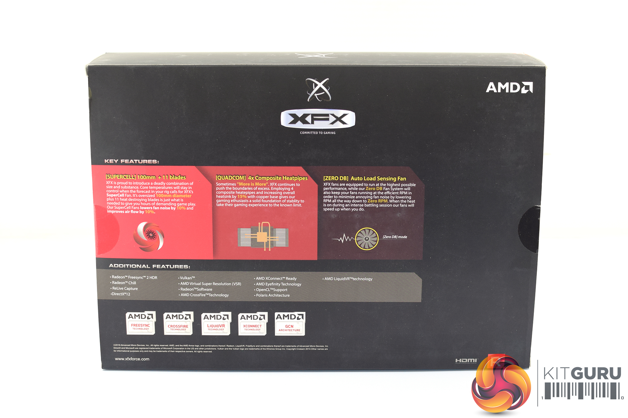 On the back of the box, three key features – the 100mm fans, composite heatpipes and zero dB mode – are highlighted, along with other Radeon features like Freesync and Chill.