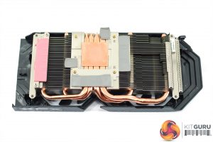 Still, what we can see here is a four heatpipe configuration, with what looks to be 2x 8mm and 2x 6mm pipes used. These feed out from a copper coldplate which contacts with the GPU die, while there is also a separate plate for the VRAM chips, and another smaller plate at the far end for the inductors.