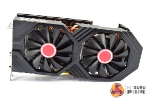 Most of the front of the shroud is taken up by the two 100mm fans which have a red central hub. The blade design is fairly straight and does remind me of ASUS ROG's last generation of Strix coolers. As already mentioned, the fans also stop spinning when there is little or no load placed on the GPU.