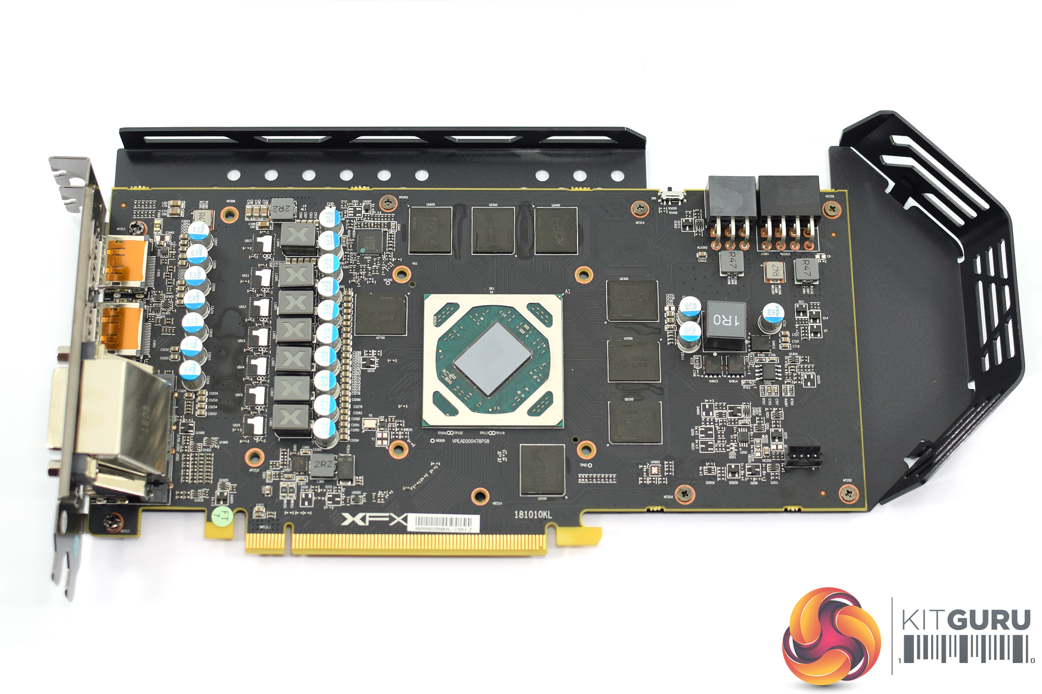 When we open up the card, too, we can also see that the actual PCB is a fair bit shorter than the shroud of the card. I measured the shroud to extend an extra 4.5cm from the end of the PCB, and hardly any of that space is even taken up by the heatsink, so it would seem XFX has decided to make the card longer for no real reason.