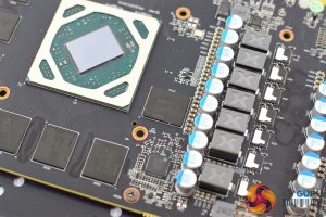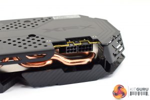 Also on the front side of the card we see the 1x 6-pin and 1x 8-pin PCIe power connectors. Just to the left of those, too, is a small BIOS switch which enables users to choose between the ‘performance' or ‘stealth' BIOS, each of which maintains clock speed at 1580MHz but adjusts the fan curve. This is something we test later in the review.