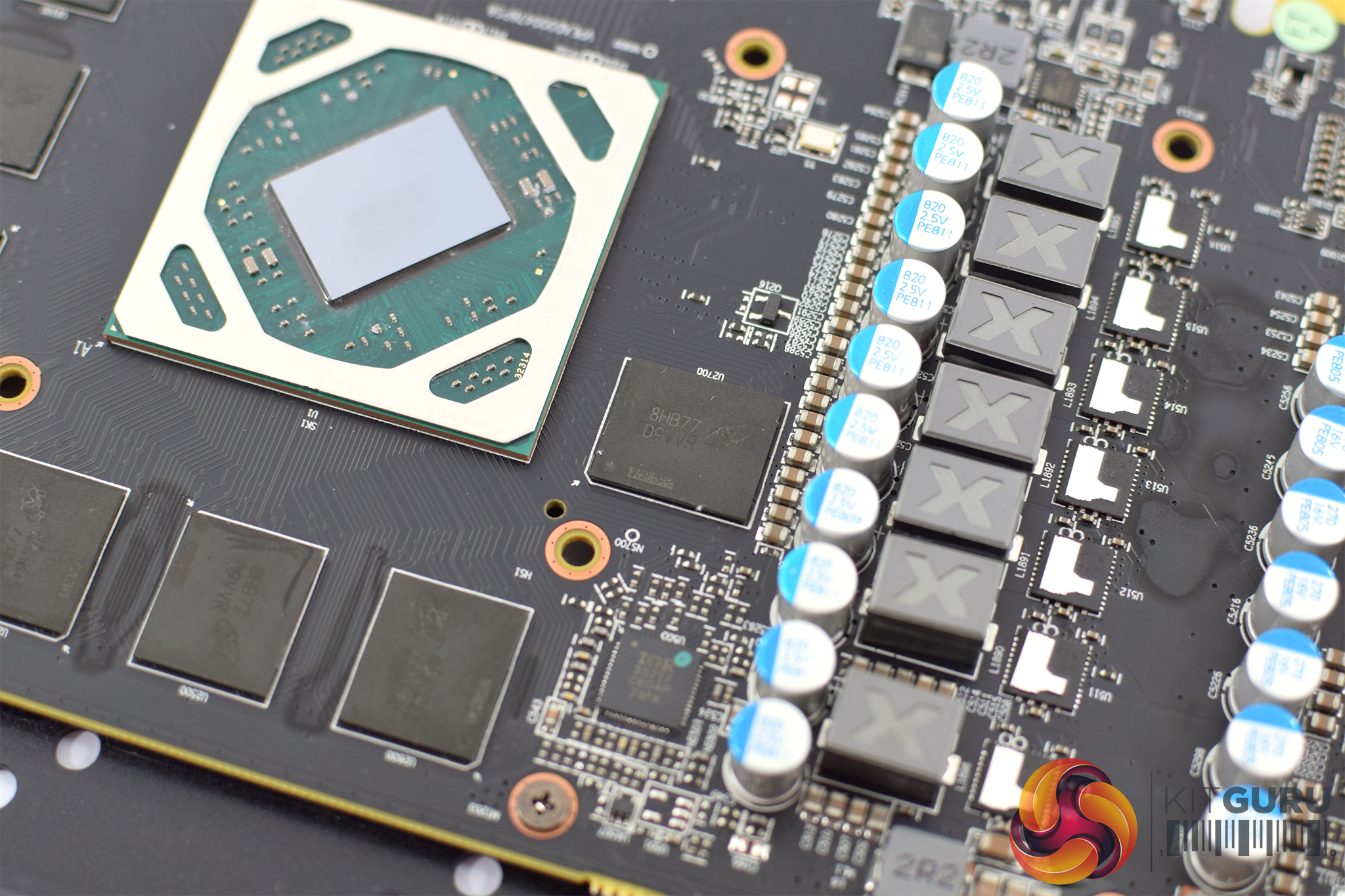 Still, looking at the PCB itself, we can see it uses 6+1 power phases set on the left-hand side of the board – the Sapphire RX 590 also went with a 6+1 phase design. The 8GB of GDDR5 memory comes from Micron, and each chip is labelled ‘8HB77D9VVR'. The GPU die itself is left unmarked.
