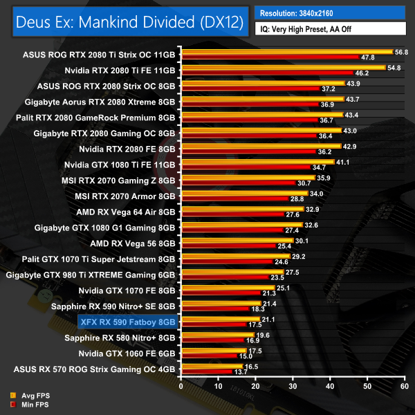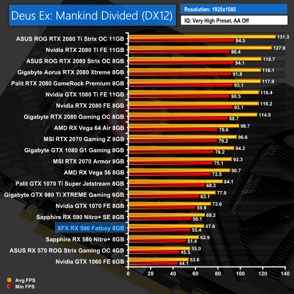 The Fatboy is again slightly behind the Sapphire Nitro+ RX 590 when it comes to Deus Ex: Mankind Divided, but if we look at the 1080p benchmark, the difference is a mere 0.6FPS.