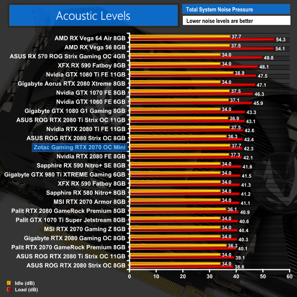 Coming now to noise levels, this is perhaps one area where the card has to make some sacrifice to achieve its low temperatures in such a small body. Peaking over 42dB is not exactly loud – but it is definitely louder than the other full-size RTX 2070 cards we have seen. The Palit 2070 is 2dB quieter, for instance, and while it doesn't seem like a big difference on paper, you can definitely tell the difference between the two.