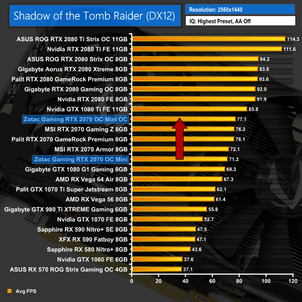 I was pretty pleased with this overclock as I wasn't sure how much the card could take given its physical limitations. We saw our Fire Strike score increase by almost 7%, while Shadow of the Tomb Raider reported an increase of almost 6FPS on average when playing at 1440p.