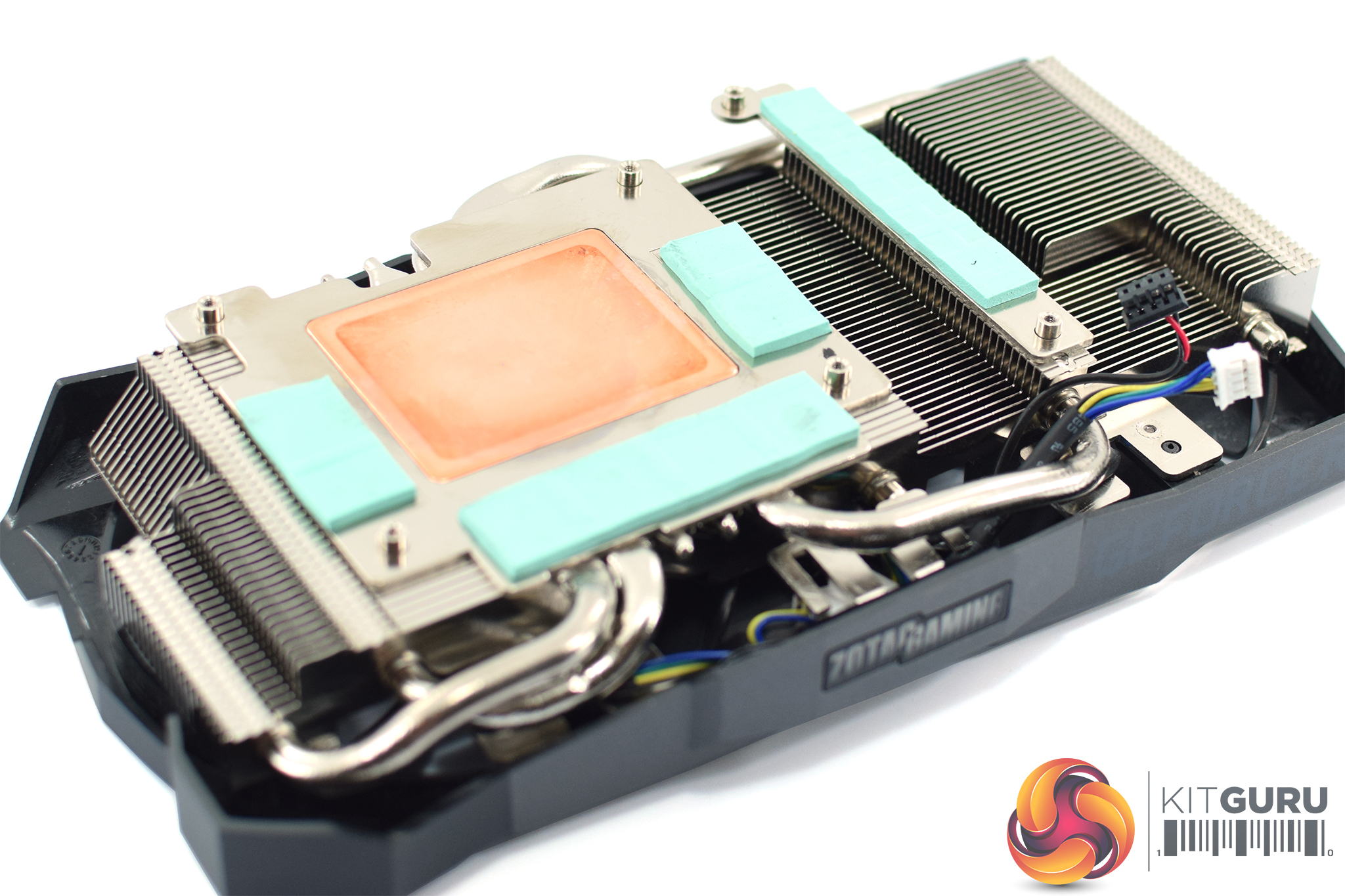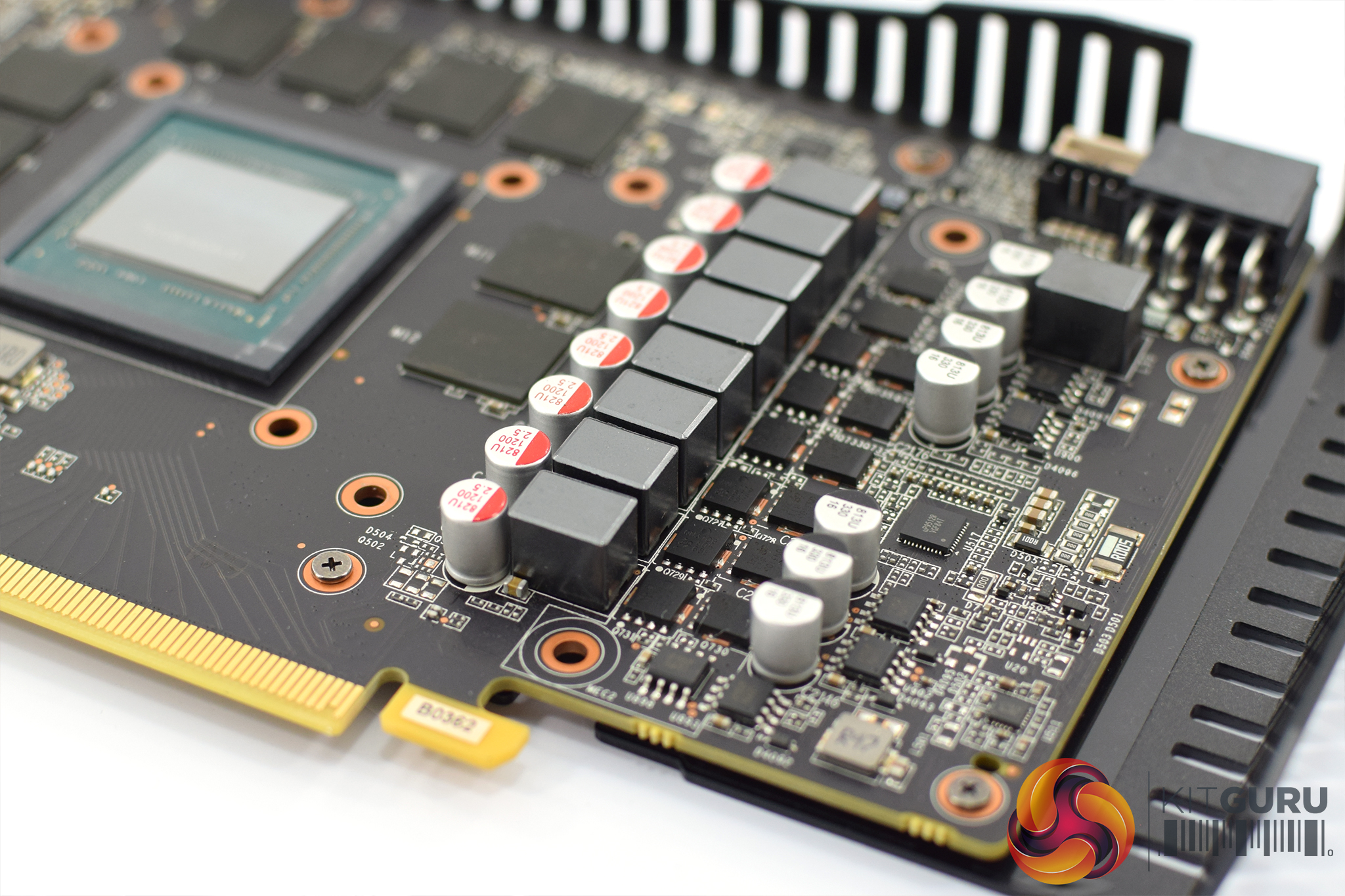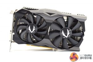 Two fans occupy the bulk of the front of the card, and you can see they are both different sizes and different blade designs. The fan on the left measures 90mm and has a swept blade design, whereas the fan on the right measures 100mm and has a straighter, flatter blade design. We asked Zotac about the reasoning behind this, and at the time of publication we are still waiting for an official response, but my guess is that the different fans are each designed to give slightly different air pressure levels to aid cooling of the GPU core, VRMs and memory chips as well as potentially reduce air turbulence.