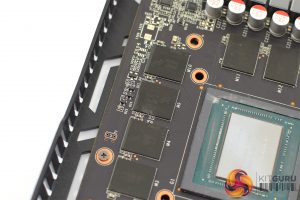 The GPU die contacts with a copper coldplate, while there is a separate coldplate surrounding that for the VRAM chips, and one more for the card's MOSFETs as well. Thermal pads are used for the VRAM chips and the MOSFETs.