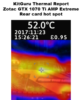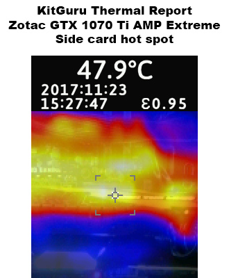 Moving onto our thermal imaging, the results are stellar here. I could not find a spot hotter than 52C on the rear of the card, while 47.9C was the peak temperature on the side of the card. This is clearly a well-engineered card, to say the least.