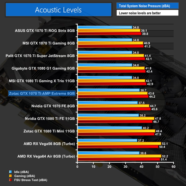 Unlike other aftermarket GTX 1070 Tis we have seen recently, this AMP Extreme does not feature a ‘zero RPM' mode where the fans stop spinning with the card under low levels of load. This means it is a bit noisier than the competition at idle.