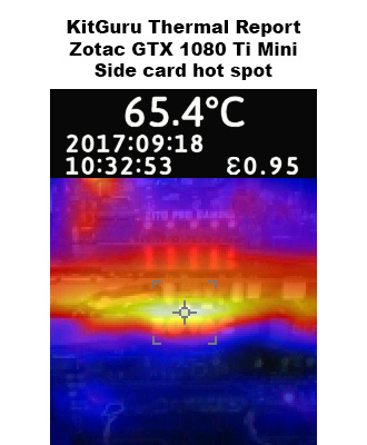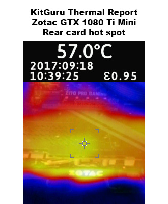The card's backplate and shroud remain quite cool, however, with a hotspot of 57C on the rear of the card. There are a couple of capacitors on the side of the card, just above the Zotac logo, and these reached up to 66C during our stress test – but that is still well within thermal limits.