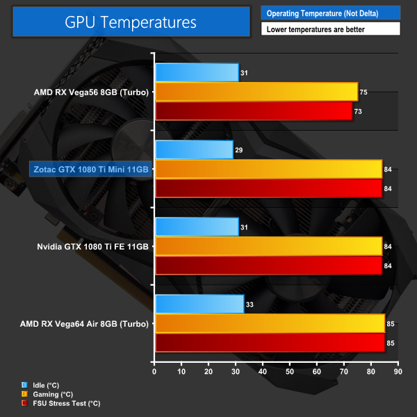 We first measure GPU temperature while the card is sat idling at the Windows 10 desktop for 5 minutes. Gaming GPU temperature is recorded by running the Deus Ex benchmark at 4K. As a maximum stress test, Fire Strike Ultra Stress Test is run 5 consecutive times and the cards’ GPU temperature levels are recorded.