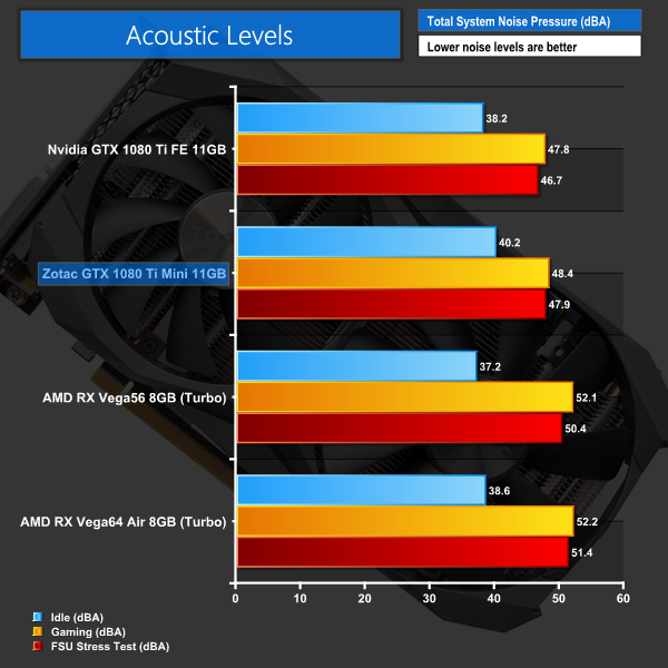 In truth, none of the four cards tested above are quiet cards. The Zotac Mini may not be louder than either of the new AMD Vega cards, but it is still not the most pleasant thing to listen to. Given that it is an aftermarket card, yet it is still louder than Nvidia's Founders Edition, probably tells you everything you need to know about the GTX 1080 Ti Mini.
