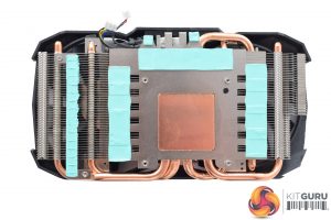 Prising the cooler from the PCB (done by simply removing 6 screws from the backplate) gives a better look at the heatpipe layout and the copper contact area. It also becomes fairly obvious that the heatsink is not large – far from it. The heatsink fins are quite densely stacked, but the card is simply too short to allow for a more sophisticated cooling solution. We look at thermals, acoustics and power consumption later in the review.