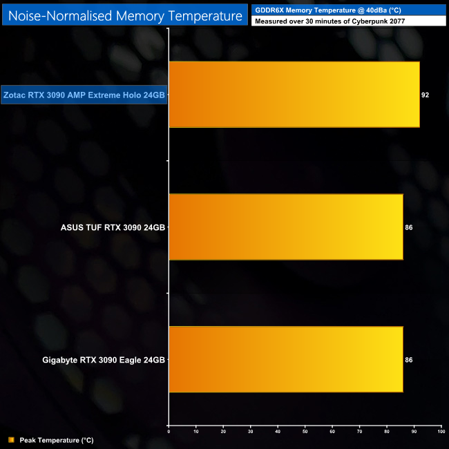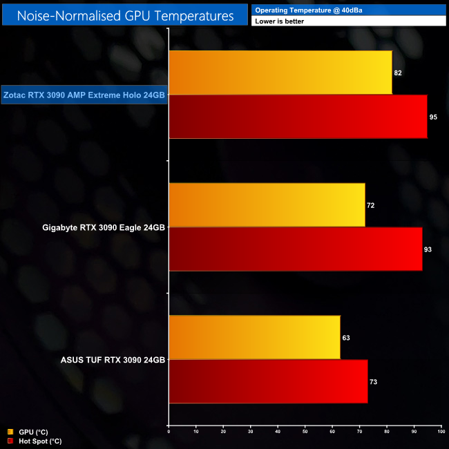 The AMP Extreme Holo tops the charts in both noise-normalised tests, when compared to the other two RTX 3090s we have tested. To hit 40dBa noise output, we had to decrease fan speed to 70%, or 1600rpm, which is a fair bit slower than the out-of-the-box behaviour, resulting in increased temperatures.