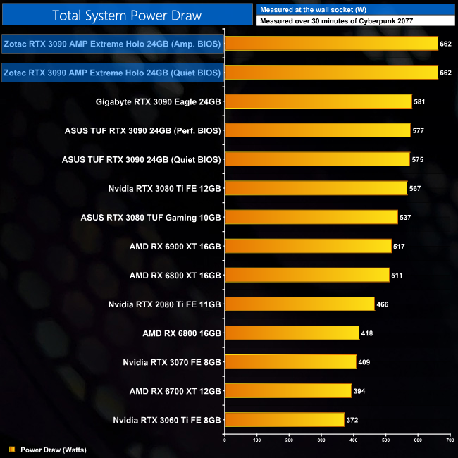 You will need a fairly beefy PSU to deal with the AMP Extreme Holo – total system power draw came in at over 660W in my testing. Zotac recommends an 800W PSU which would be fine, but if you're planning a new build around one of these cards, I'd feel more comfortable with a 1000W unit, both to give more efficiency headroom now, but also to ensure there's ample wattage left over for future upgrades.