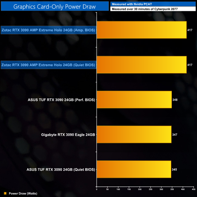 This last graph illustrates just how much extra power the AMP Extreme Holo draws compared to the other RTX 3090 models we have tested. Both BIOS, by the way, share the same power target – the only difference is fan speed.