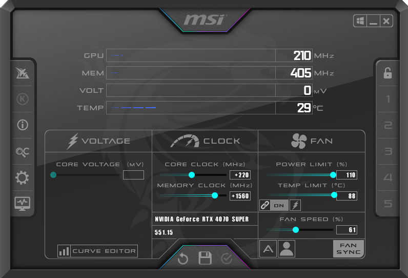 For our manual overclocking tests, we used MSI Afterburner. Our best results are as below.