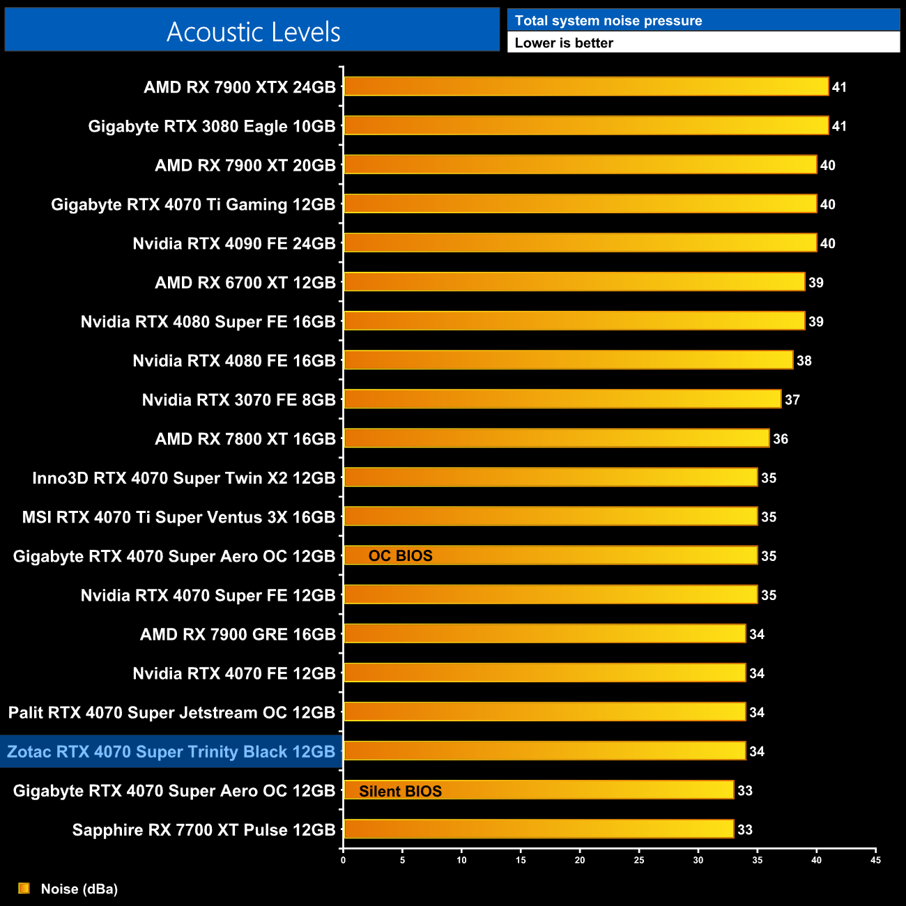 We take our noise measurements with the sound meter positioned 1 foot from the graphics card. I measured the noise floor to be 32 dBA, thus anything above this level can be attributed to the graphics cards. The power supply is passive for the entire power output range we tested all graphics cards in, while all CPU and system fans were disabled. A reading under load comes from running Cyberpunk 2077 for 30 minutes.