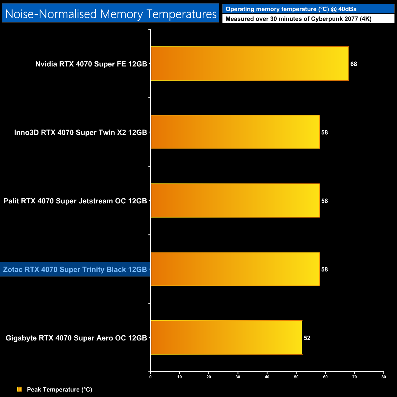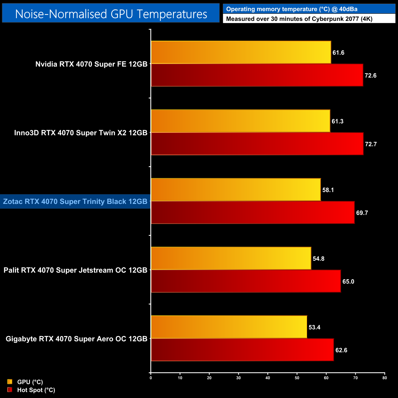 When normalising noise levels to 40dBa and then re-testing thermal performance, the Zotac Trinity Black Edition sits right in the middle of the pack – it can't quite match the likes of the Aero OC, but it does run a few degrees cooler than the Twin X2 or Founders Edition.
