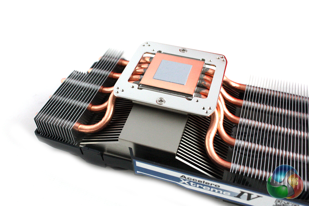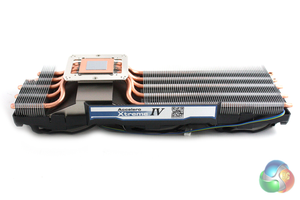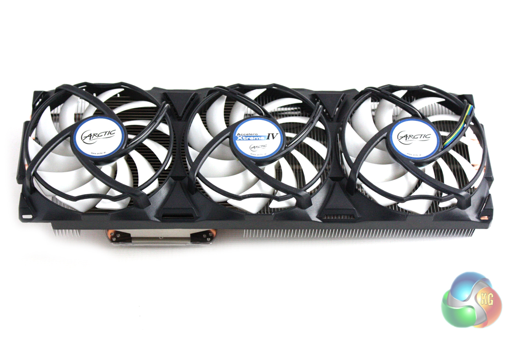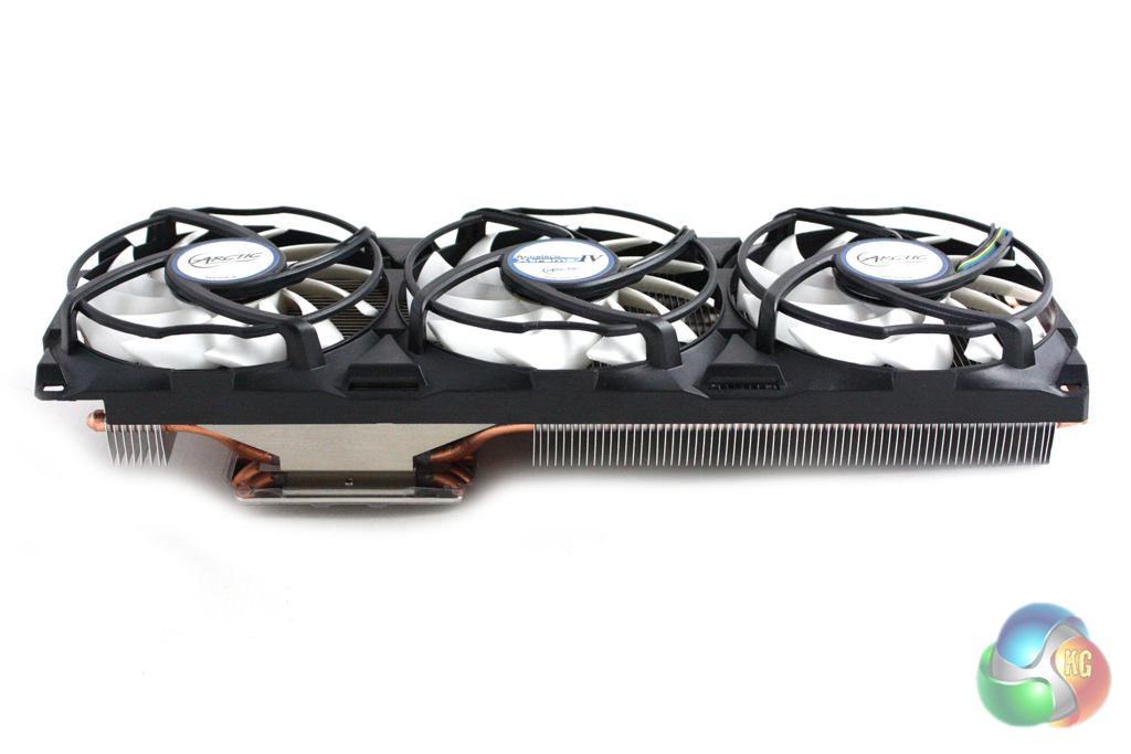 The most prominent feature of the Accelero Xtreme IV is the array of three 92mm fans which span the top of the cooler. These are configured to blow down towards the PCB, with air passing through the heatsink and out past the PCB underneath.