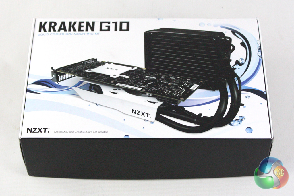 The Kraken G10 is supplied familiar NZXT packaging, featuring a black and white livery. The front of the box features a large image of a graphics card featuring the Kraken G10 bracket in conjunction with an X40 water cooler.