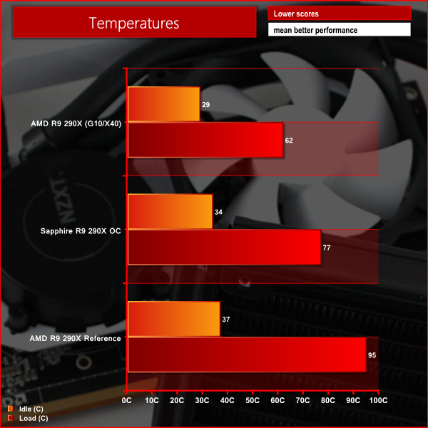 Here we can see that the Kraken G10 and X40 combination offers excellent cooling performance, especially compared to the reference design. Although the Sapphire model runs hotter, we have to consider that it is a factory overclocked model which will account for some of the temperature increases.