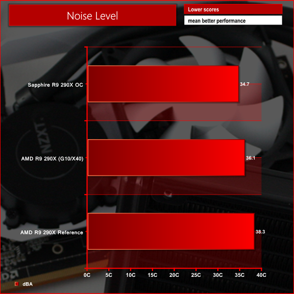 Here we can see that the Sapphire model is actually the quietest in the comparison, however the Kraken 10 and X40 combination comes in fairly closely behind. It is worth bearing in mind that you can set up different fan profiles with the Kraken X40 to reduce this further.