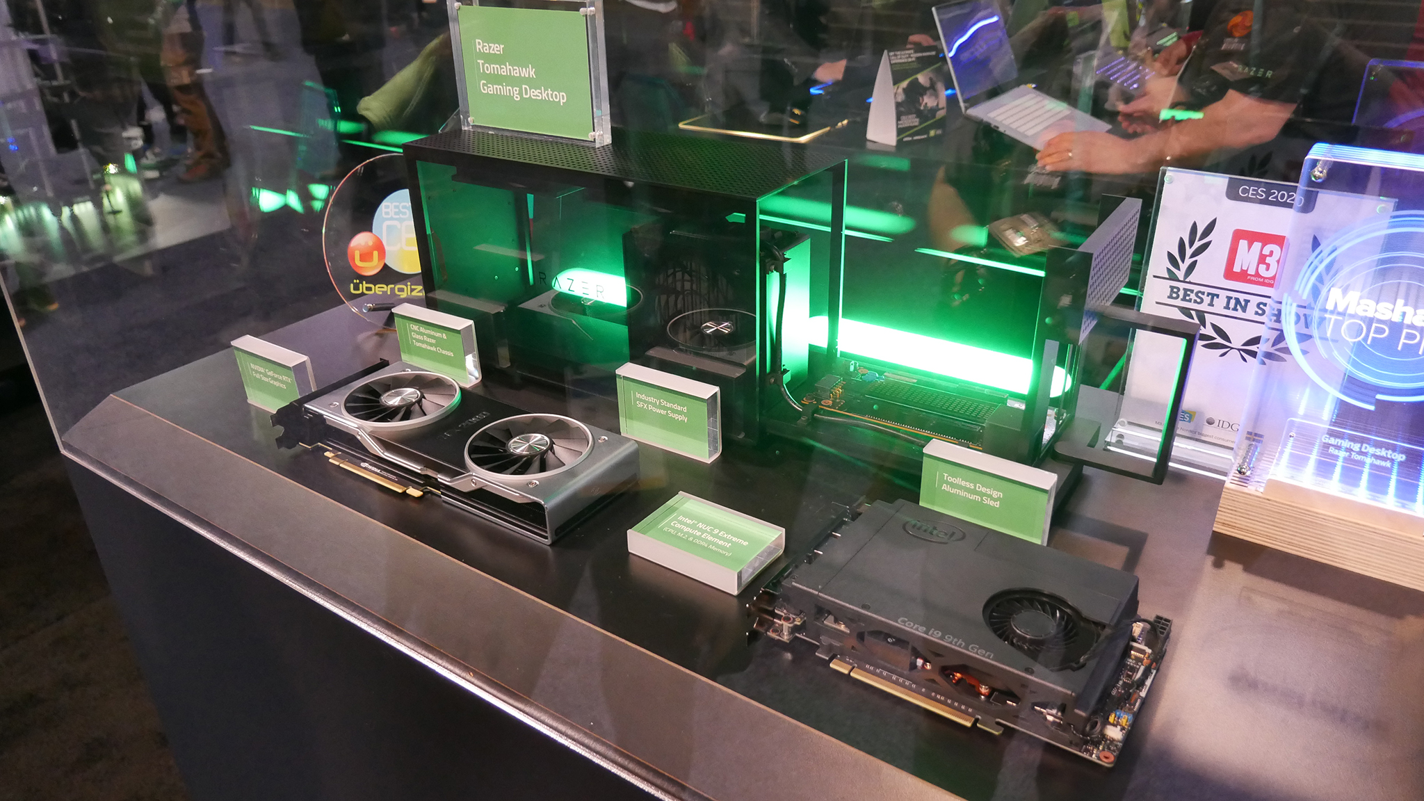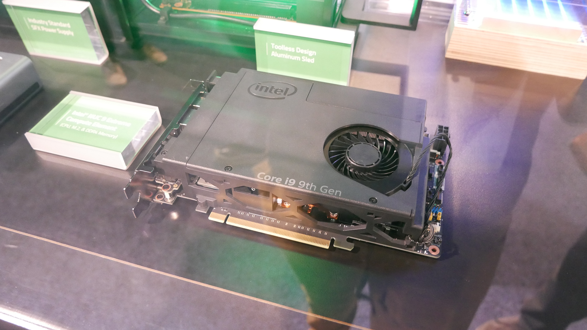 The Intel NUC 9 is also capable of containing high-end graphics too, at the EVGA suite an RTX 2060 KO GPU was installed in the NUC 9 and even more impressively, at the Razer booth there was an Intel Element based system containing an Nvidia RTX 2080 Ti. This could imply that the Intel NUC 9 Extreme may be used as a high-end gaming or workstation system, as long as thermal dissipation is up to the job.
