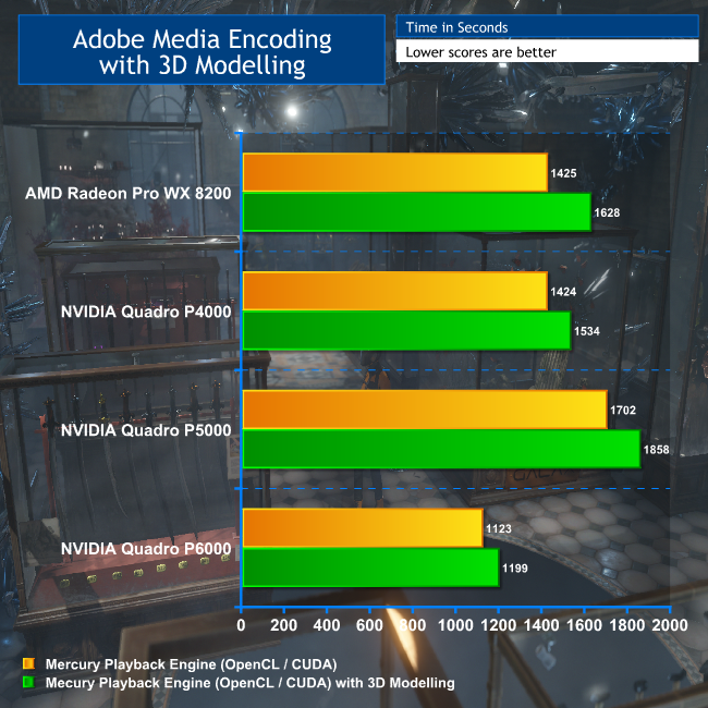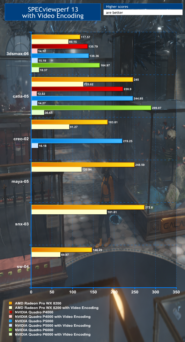 The WX 8200 does take a bit more of a hit in its encoding time (14 per cent longer to complete) than the NVIDIA cards (9 per cent or lower). But in the balance, you can encode with the WX 8200 using GPU Compute acceleration whilst doing useful 3D modelling at the same time, whereas you can't with any of the NVIDIA Quadros, even the P6000.
