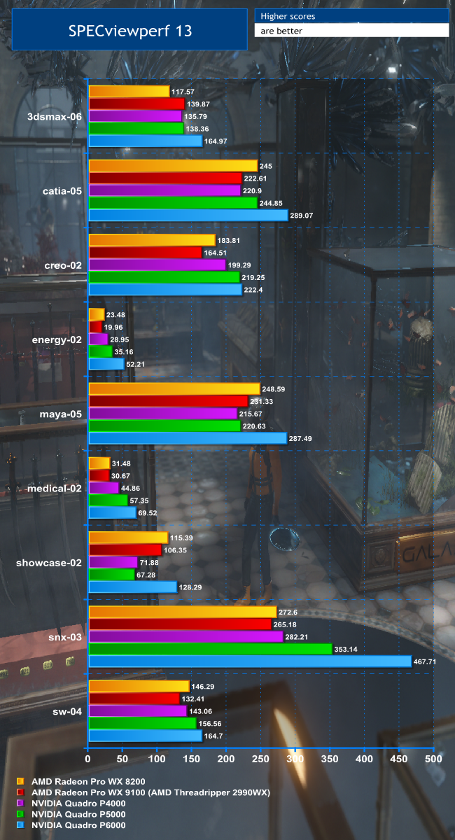 The results with SPECviewperf 13 are much more varied, showing how much professional graphics choice is considerably affected by precisely what software you intend to run. Note that in these tests the AMD Radeon Pro WX 9100 was tested on a slightly different platform, which may have affected the results in some viewsets, so these scores are included merely for comparison.