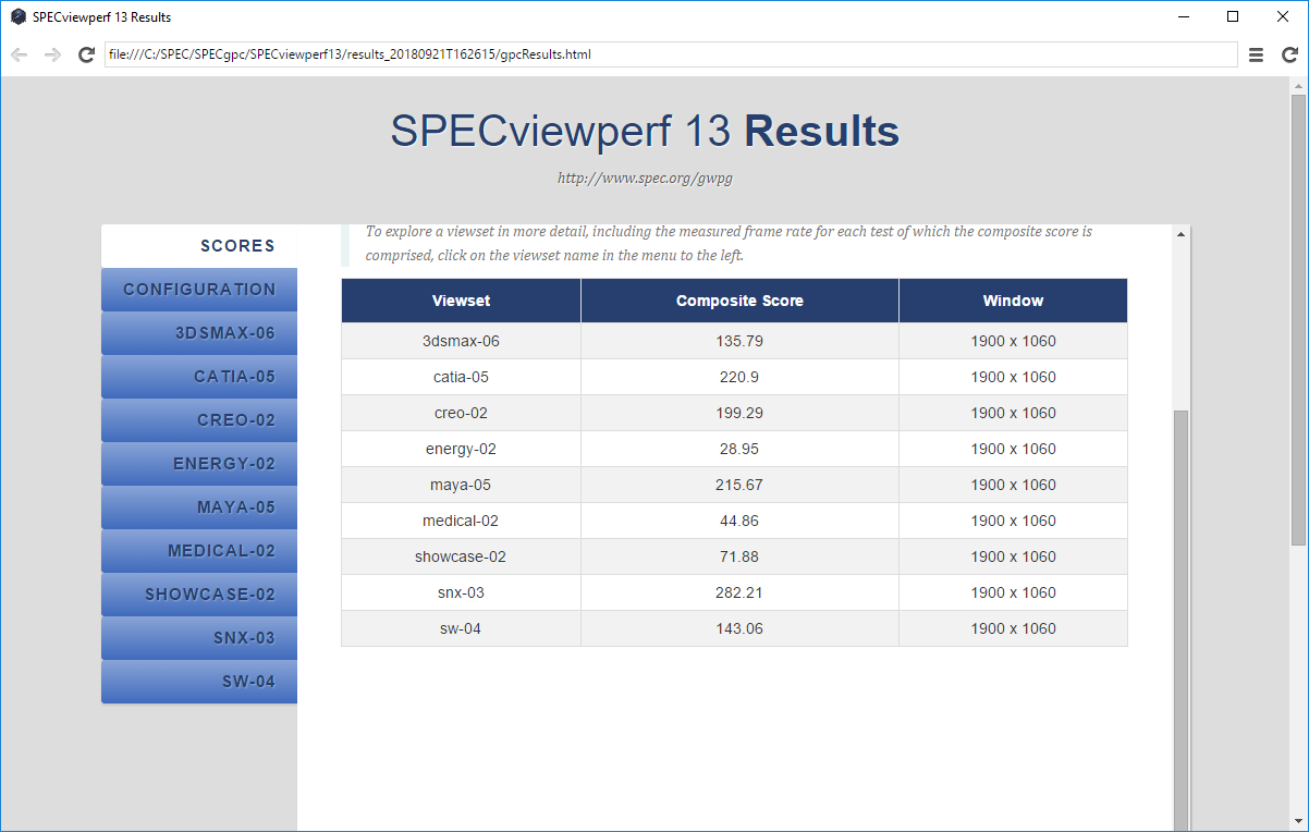 The SPECviewperf 13 benchmark is the worldwide standard for measuring graphics performance based on professional applications. The benchmark measures the 3D graphics performance of systems running under the OpenGL and Direct X application programming interfaces. The benchmark’s workloads, called viewsets, represent graphics content and behavior from actual applications.