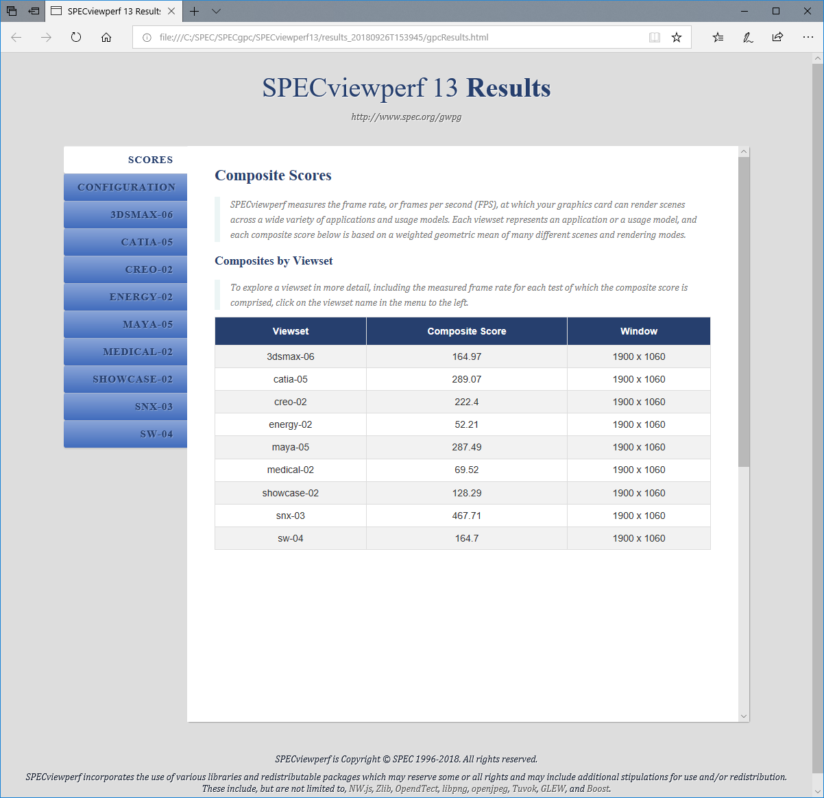 SPECviewperf 13 is a comprehensive upgrade of previous versions of the benchmark. Medical and energy viewsets incorporate new models and raycasting for volume visualization; the Maya viewset features new models based on the SPECapc for Maya 2017 benchmark; and the Creo viewset has been updated with fresh application traces. All other viewsets have been recompiled with minor changes. Results from SPECviewperf 13 are not comparable to those from earlier versions.