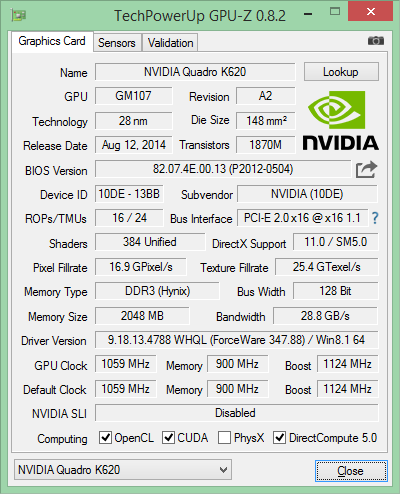 To illustrate a wide range of possible workstation specifications, we used four cards from NVIDIA's current Quadro range. These were the K620, K2200, K4200, and K5200. This wasn't the entire range – we didn't include the super-low-end K420, the mid-range K1200 or the ultra-high-end K6000 or M6000. The cards we chose represent the most frequently supplied graphics in workstations aimed at mainstream applications.