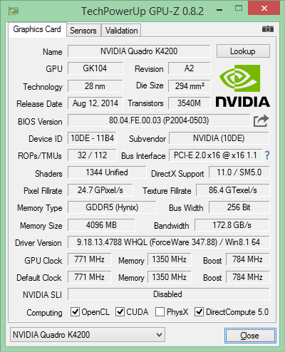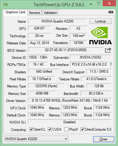The K620 is a basic professional 3D accelerator. It still sports 384 CUDA cores, which is a decent quantity, and offers 2GB of frame buffer, but the latter is just DDR3 and the memory interface 128-bit, so only 29GB/sec bandwidth is available. The K2200 is much more potent as a 3D accelerator, with 640 CUDA cores and 4GB of GDDR5 memory, offering 80GB/sec bandwidth. With the K4200 we enter the high end. This card provides 1,344 CUDA cores, and although it has the same 4GB of GDDR5 memory, the 256-bit bus means the bandwidth is more than doubled compared to the K2200, to 173GB/sec. Finally, the K5200 is an ultra-high-end card with 2,304 CUDA cores and a whopping 8GB of GDDR5 memory. Like the K4200, it has a 256-bit memory bus, but faster memory ensures 192GB/sec of bandwidth.