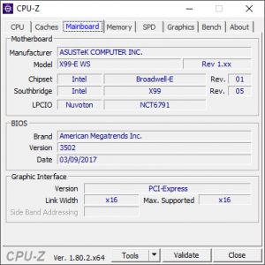 The processor and memory are installed in an ASUS X99-E WS motherboard, which is a pretty standard inclusion for Intel Socket 2011-v3 processors. As the name implies, it uses the Intel X99 chipset, with eight DIMM slots offering the maximum memory described above. It has seven full-sized x16 PCI Express slots, although if you have more than two graphics cards at least one of them will be running at x8, because the maximum number of lanes available from an Intel CPU is 40.