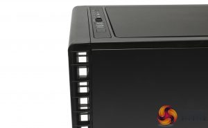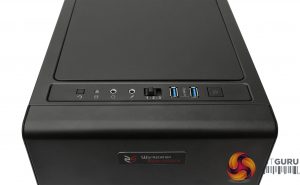 The front ports are actually on the top edge, with power and reset buttons either end. You get two USB 3.0 connections, plus headphone and microphone minijacks, and a switch to choose the cooling fan speed.