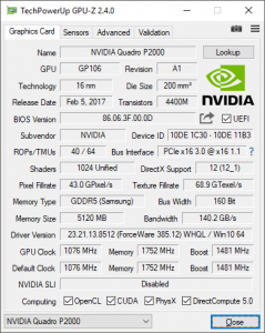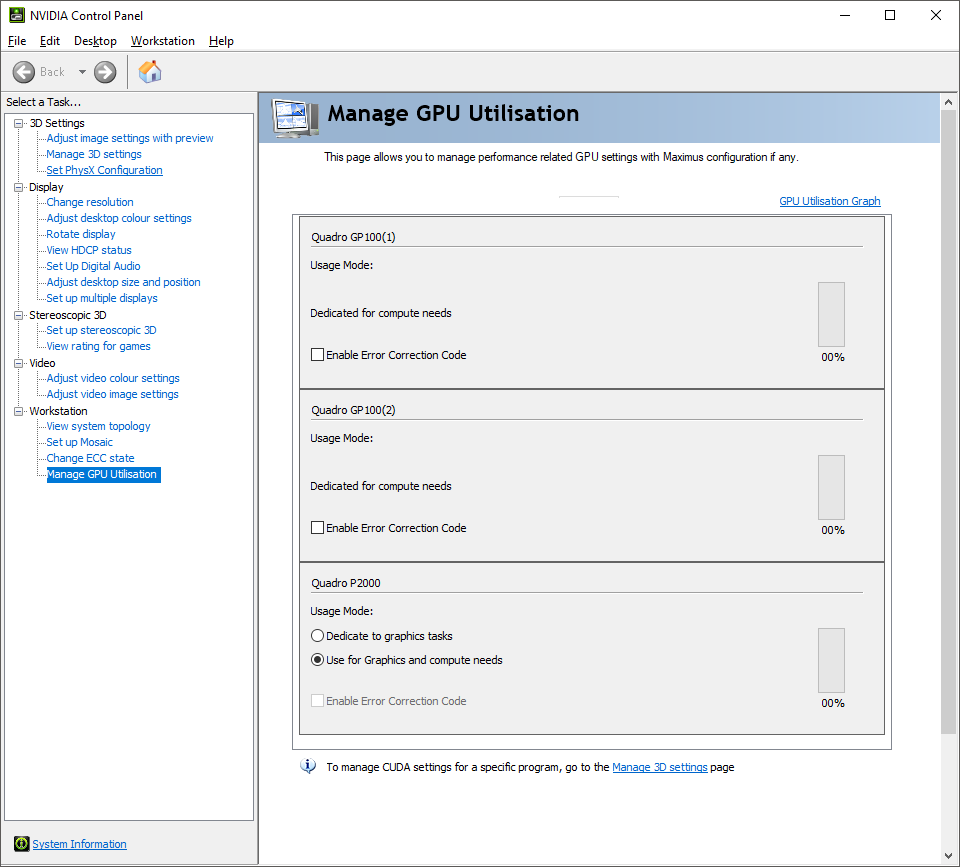 Our sample NVIDIA Quadro GP100s were configured exclusively for GPGPU work, as you can see from the NVIDIA Control Panel screenshot above. You can still plug monitor cables into them and these will work, but the NVIDIA Quadro P2000 will be doing the graphics acceleration and then sending the results to whichever card is attached to the screen over PCI Express, reducing performance.
