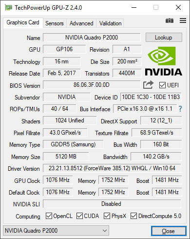 The Quadro P2000, despite being a mid-range card, is still pretty decent, with 1,024 CUDA cores running at 1,076MHz and 5GB of GDDR5 memory providing 140.2GB/sec of bandwidth. But it's a pale shadow compared to the GP100s, and is only there to provide graphics display and reasonable real-time 3D modelling acceleration.