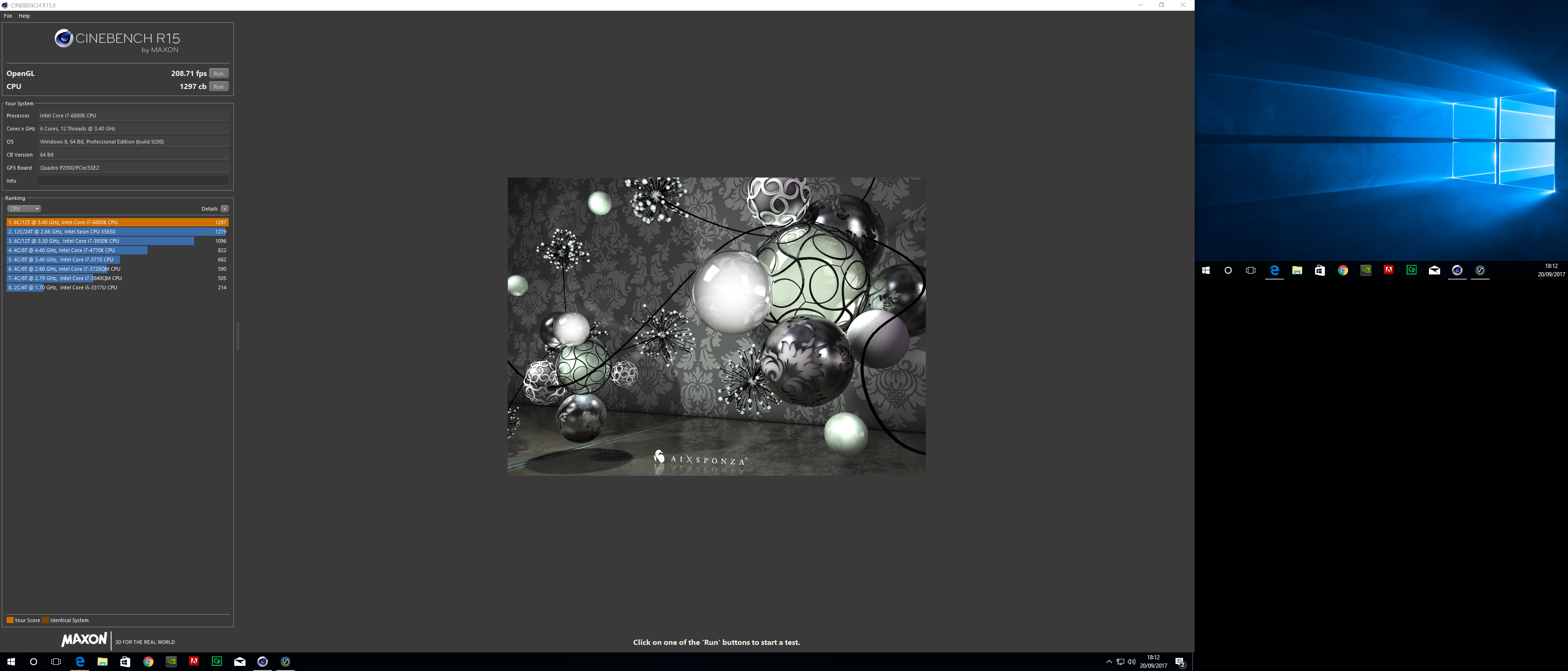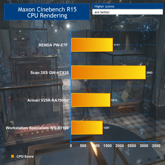 The CPU rendering portion of Maxon Cinebench R15 shows that the six-core Intel Core i7-6800K can't keep up with the eight-core (and greater) processors in the comparison systems, despite the 4.2GHz overclock. But that's not what this system is about anyway.