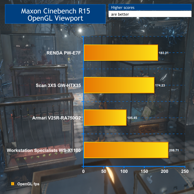 The Cinebench OpenGL results, on the other hand, reveal that the NVIDIA Quadro P2000 is pretty good for running Maxon Cinema 4D, beating the AMD Radeon Pro Duo in the Armari, the AMD FirePro W8100 in the RENDA, and even the NVIDIA Quadro M6000 in the Scan system. Note that the Quadro GP100s are playing no part in this test.