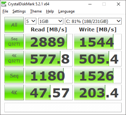 Crystalmark is a useful benchmark to measure theoretical performance levels of hard drives and SSD’s. We are using V5.2.1 x64.