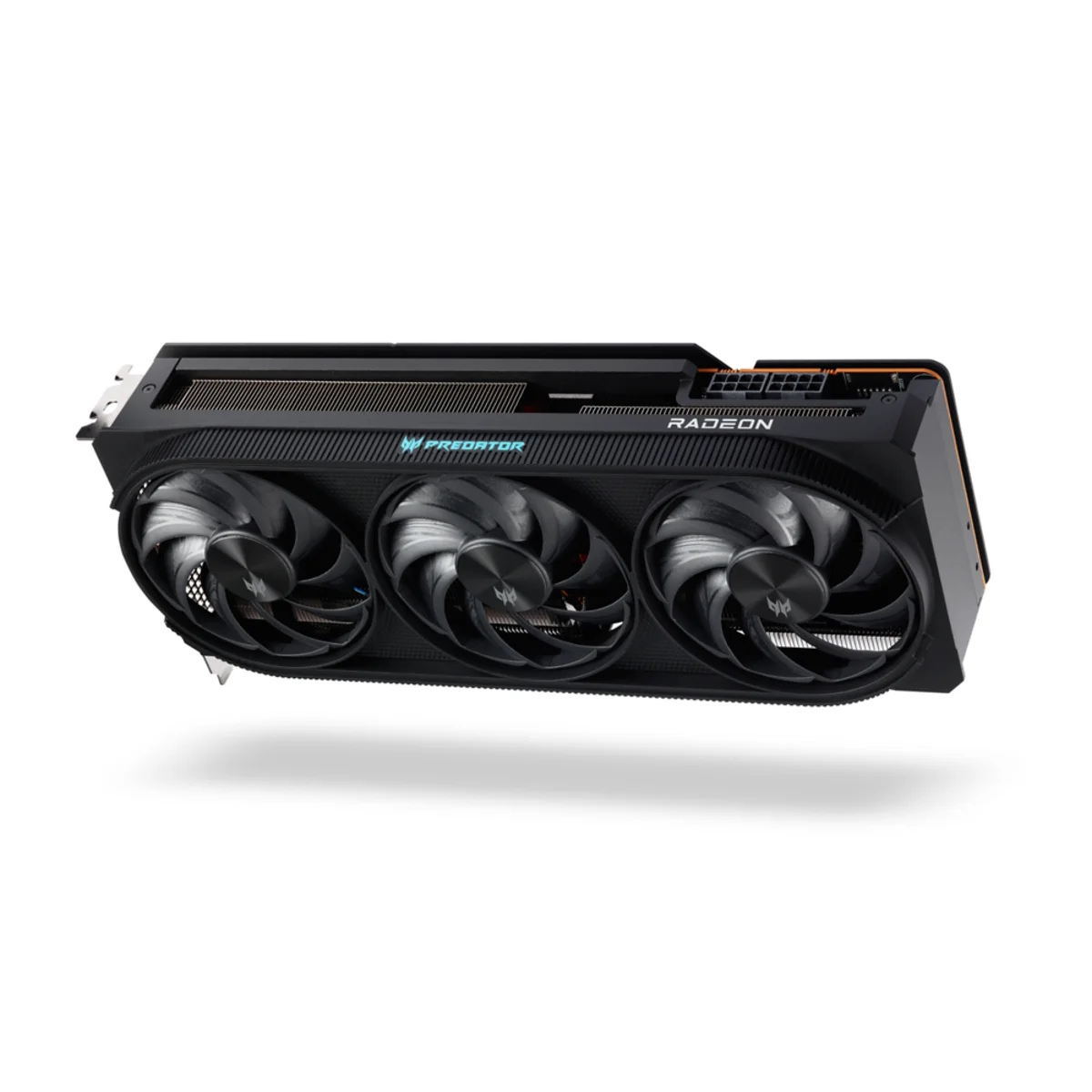 Moving on to the Predator BiFrost AMD Radeon RX 7800 XT OC graphics card, this card is powered by two PCIe 8-pin connections. The Predator BiFrost AMD Radeon RX 7800 XT OC graphics card can achieve clock rates of up to 2,254MHz game clock and up to 2,565MHz boost clock. The Predator BiFrost AMD Radeon RX 7800 XT OC graphics card boasts a cooling system that includes three Predator FrostBlade 3.0 fans, a unique ringed design, and a wave-patterned blade texture to improve airflow, paired with a vapour chamber to optimise heat dispersion. DIY gamers will find the slim design appealing, as it measures 281.9 x 117.9 x 61.4mm and takes up only three slots. The graphics card offers an HDMI 2.1 connector and three DisplayPort 2.1 connections. Finally, the Predator BiFrost Utility App allows players to monitor the device's performance and adjust fan speeds and graphical parameters.
