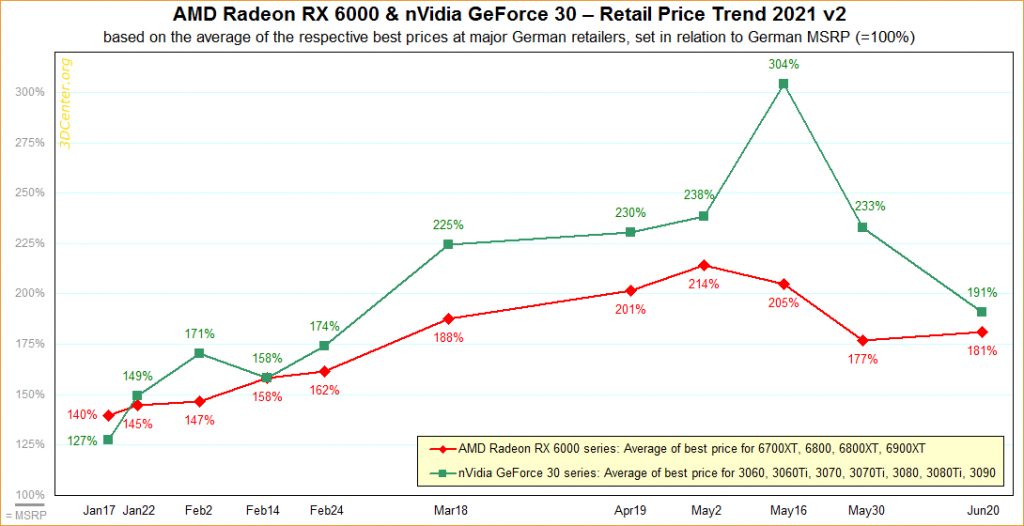 The following tables summarise 3DCenter's investigation on the pricing of AMD Radeon RX 6000 series and Nvidia RTX 30 series cards. All prices are as of June 20, 2021 and only deliverable offers were taken into consideration.
