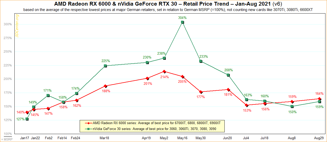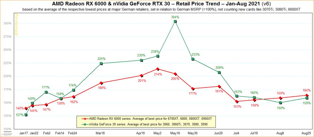 As reported by 3DCenter, since from May to July, AMD Radeon RX 6000 series prices have had some ups and downs, but Nvidia GPU prices have decreased consistently. However, as of the 29th of August, data shows that prices are on the rise once again.