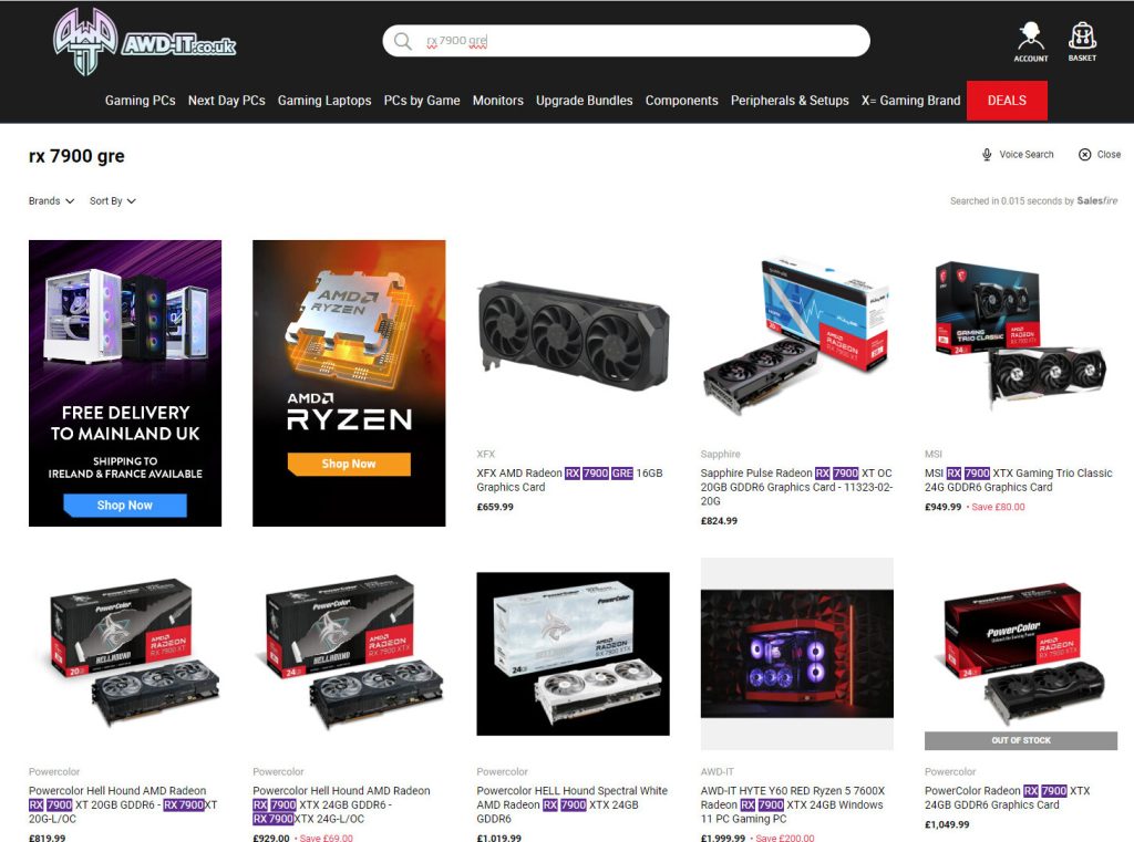 As noted by TechPowerUp, the XFX reference design Radeon RX 7900 GRE is the first model to be available in the UK (now sold out). Priced at £659.99, the card may not be considered a fantastic value, especially since the RX 7900 XT is currently available for £699.