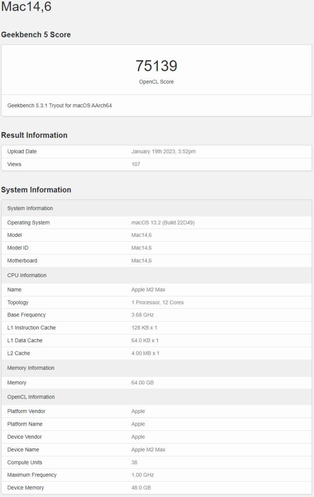 As of now, we can't say much about its CPU performance, but thanks to the Geekbench OpenCL entry spotted by Wccftech, we may have a vague idea about what the GPU will be capable of. Note that this particular system used an M2 Max with a 38-core GPU, the highest core count configuration.